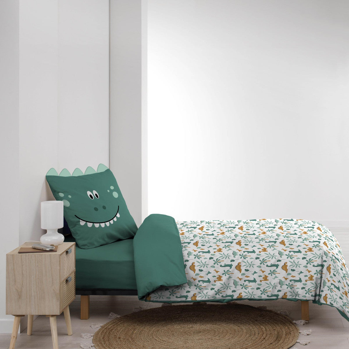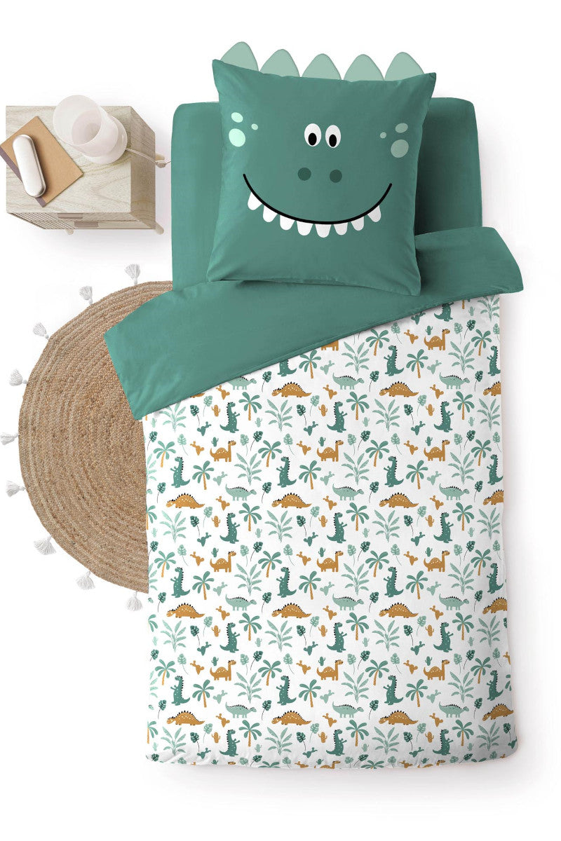 Giv dit barn en spændende og tryg søvn med vores fantastiske børnesengetøj, der er dekoreret med søde dinosaurer. Dette sengesæt kombinerer sjovt og farverigt design med høj komfort og sikkerhed, hvilket gør det til et ideelt valg for små dinosaurentusiaster. Sengetøjet har et levende design med glade dinosaurmotiver i grønne og brune nuancer, der skaber en sjov og eventyrlig atmosfære i børneværelset. Pudebetrækket er prydet med et stort, smilende dinosauransigt, komplet med søde tænder og detaljer, som dit barn vil elske. Dynebetrækket har et mønster af forskellige dinosaurer og palmer, hvilket giver en dejlig junglefølelse. Vores sengetøj er fremstillet af 100% bomuld, der er blødt og åndbart, hvilket sikrer en behagelig og afslappende søvn. Materialet er slidstærkt og let at vedligeholde, hvilket gør det ideelt til daglig brug. Sengetøjet er OEKO-TEX® certificeret, hvilket betyder, at det er testet og fri for skadelige stoffer. Du kan trygt lade dit barn sove i dette sengetøj, velvidende at det lever op til strenge internationale standarder for sundhed og sikkerhed.