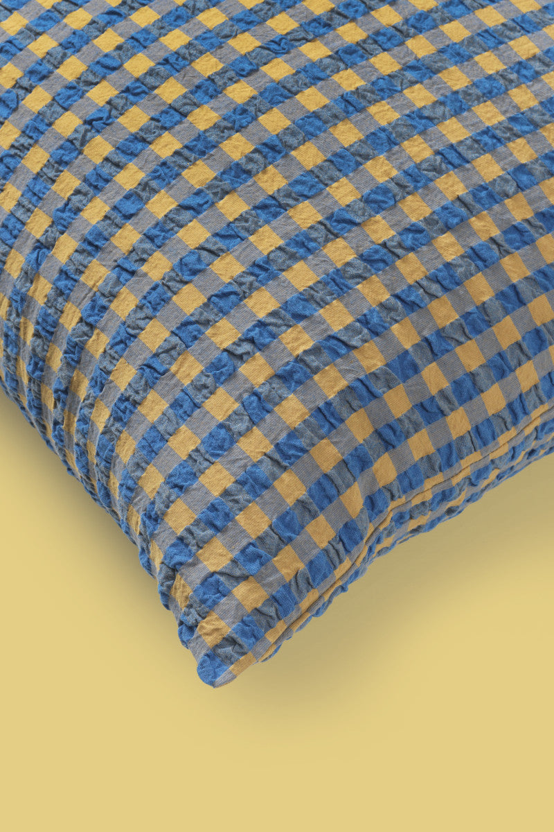 Det nye ternet sengesæt i blå/okker Bæk&Bølge fra JUNA er designet til at give dig en følelse af varm friskhed og dyb ro på samme tid. Den varme blå farve skaber en frisk og opkvikkende stemning, mens den dybe okkerfarve skaber en følelse af ro og hygge, som minder om en gåtur i skoven eller på stranden en smuk efterårsdag. Materialet er 100% økologisk bomuld, som både er OEKO-TEX®-mærket og GOTS-certificeret, og det er ovenikøbet strygefrit, så du kan få et pænt og glat resultat uden besvær. Pudebetrækket har en praktisk kuvertlukning, mens dynebetrækket har en bekvem knaplukning. Og hvis du allerede har flere sengesæt fra JUNA, kan du mikse og matche de forskellige farver og mønstre for at skabe din helt egen unikke stil i soveværelset.