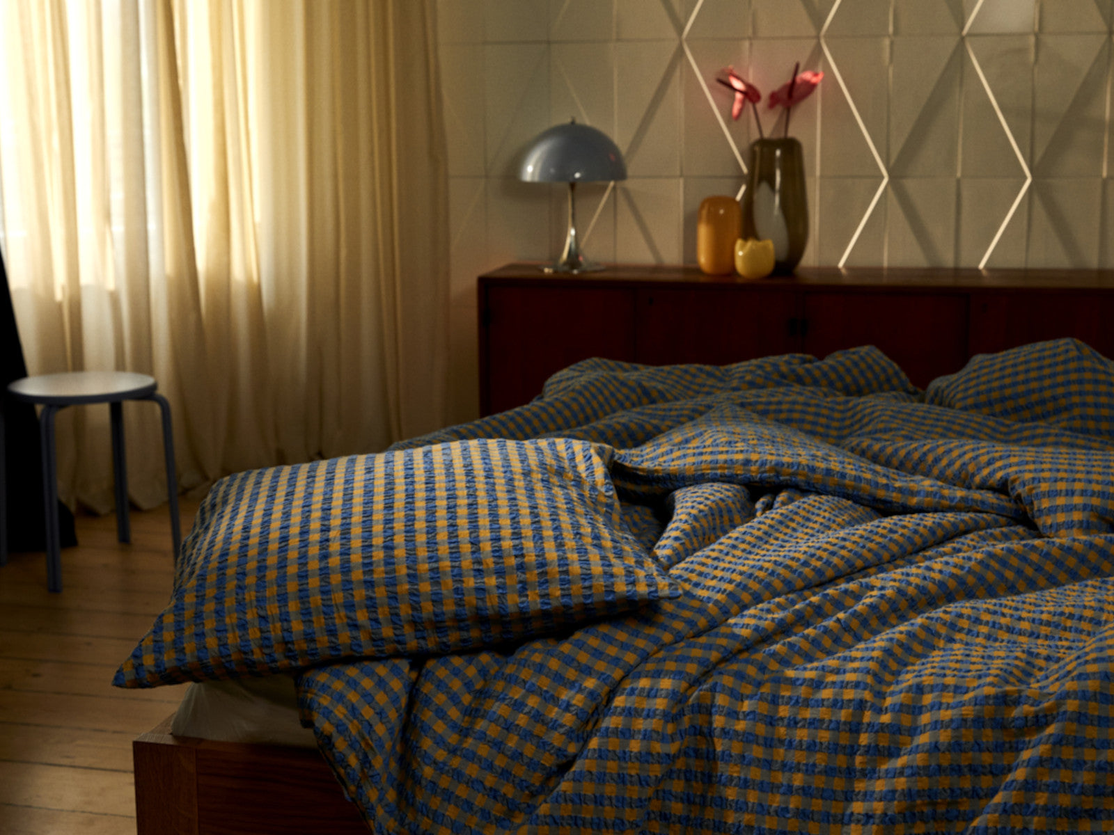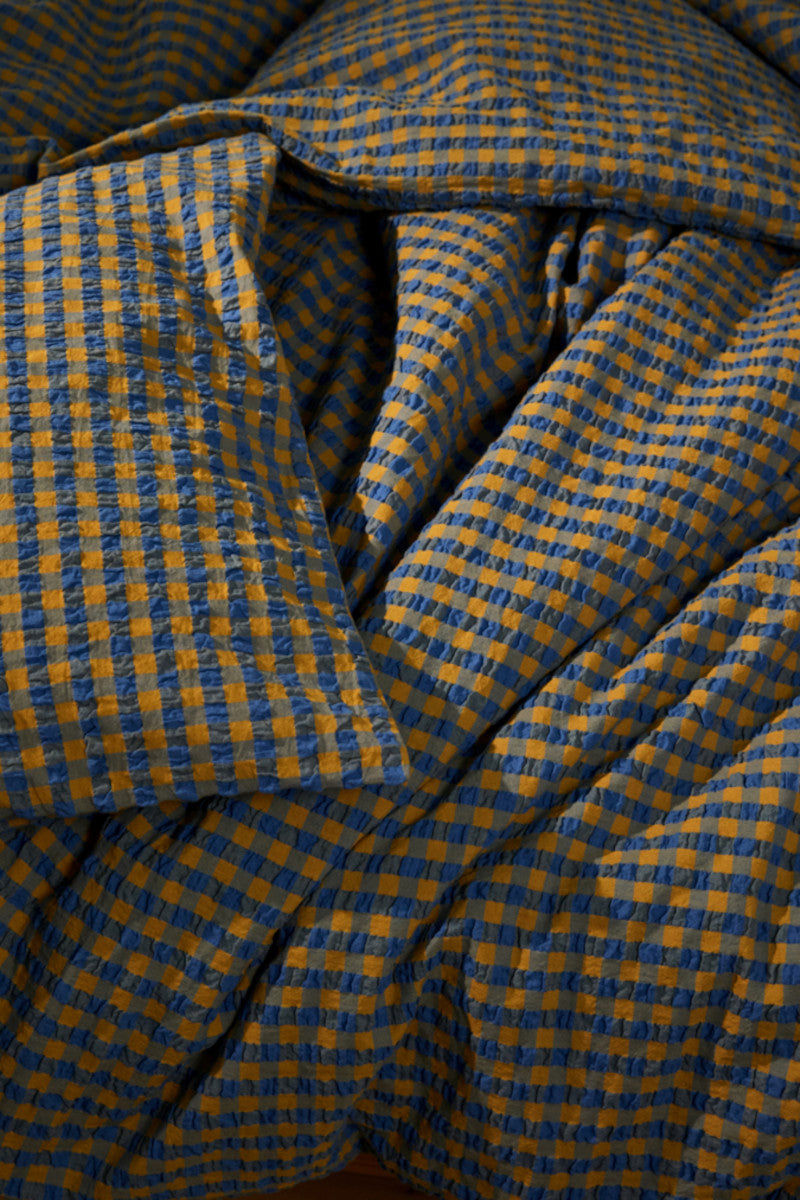 Bæk&Bølge-sengesættet i tern i farverne blå/okker er det nye tilføjelse til JUNAs sortiment. Blå farve giver en varm og frisk fornemmelse, mens okker tilføjer dybde og ro til sengesættet, som minder om en afslappende gåtur ved skov og strand på en smuk efterårsdag. Materialet i sengesættet er 100% økologisk bomuld, der er både OEKO-TEX®-mærket og GOTS-certificeret og endda strygefrit. Sættet indeholder et pudebetræk med kuvertlukning og et dynebetræk med knaplukning. Hvis du har flere sengesæt fra JUNA, kan du blande de forskellige farver og mønstre på kryds og tværs for at skabe din helt egen stil i soveværelset.