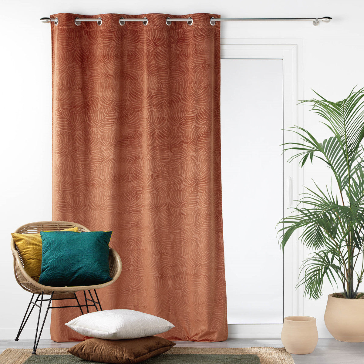 Douceur d'Intérieur har designet dette gardin med både æstetik og funktionalitet for øje. Den varme terrakotta orange farve og det præget velourdesign skaber en hyggelig og elegant atmosfære i ethvert rum, samtidig med at gardinet effektivt blokerer for lys.