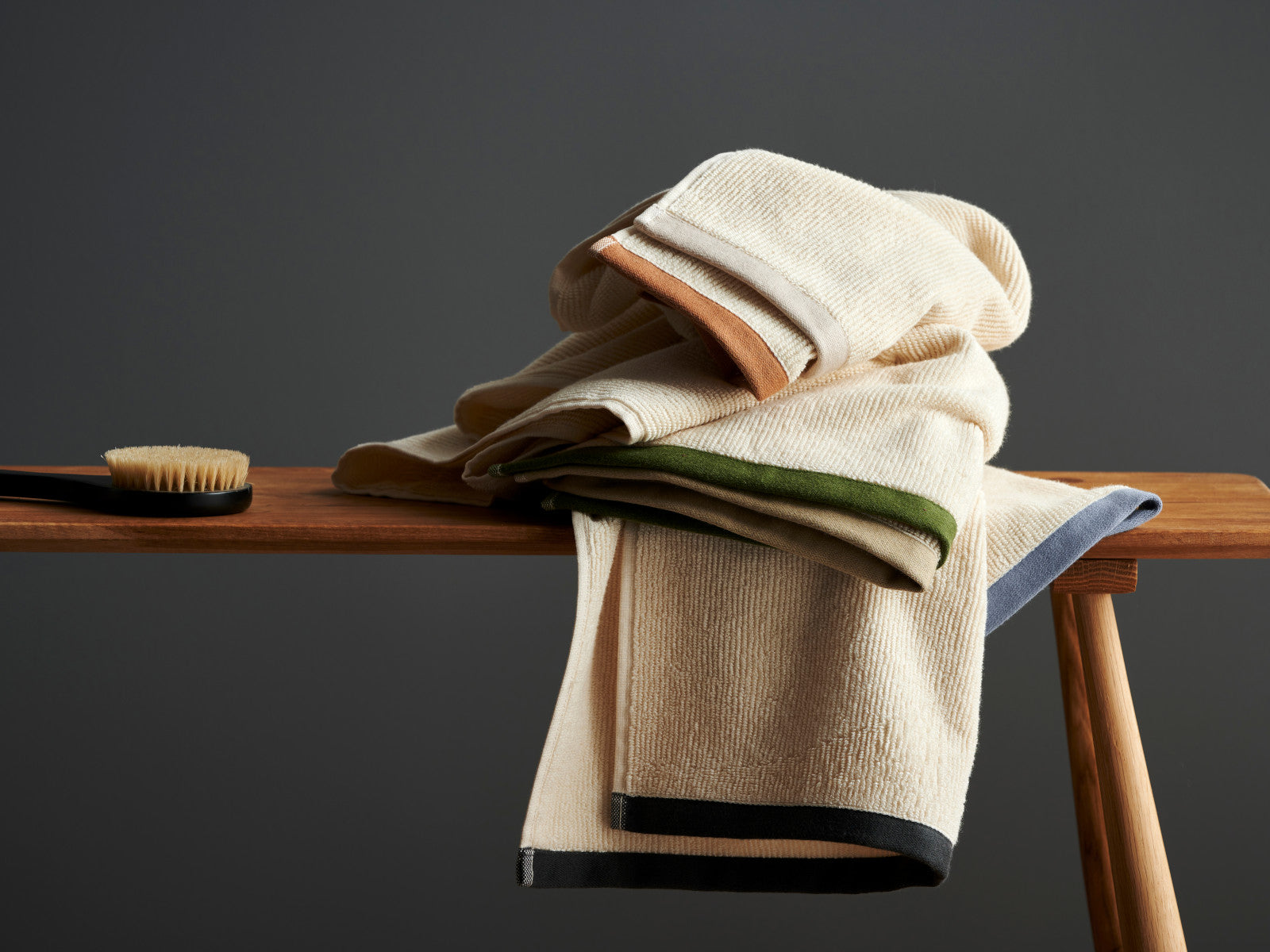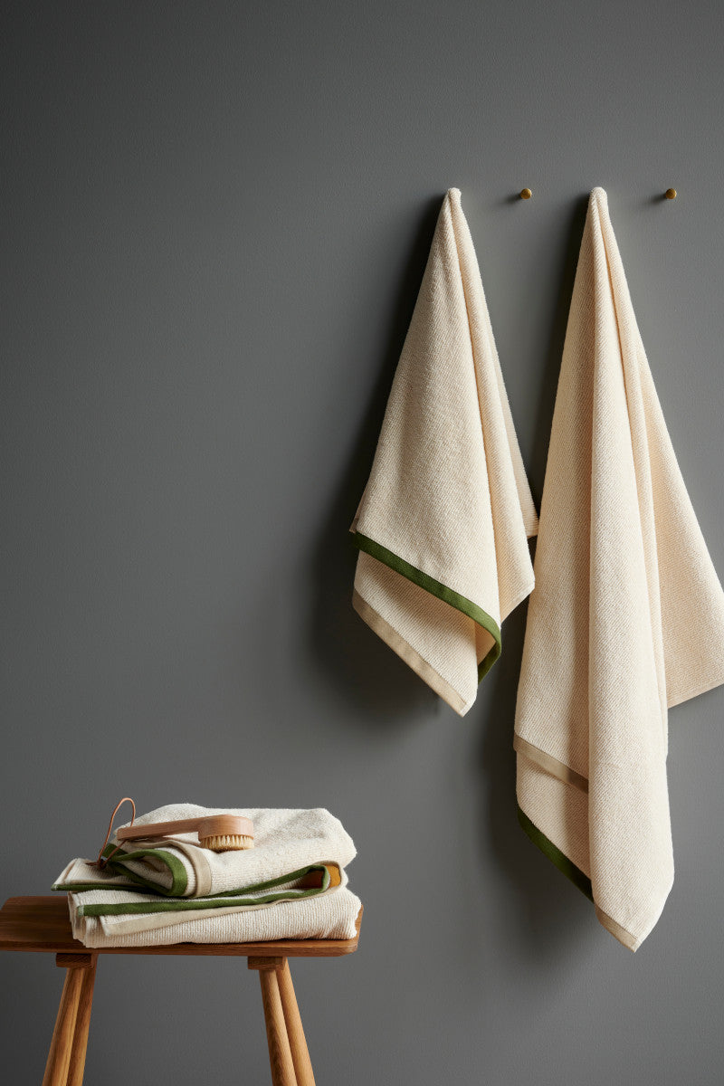 Ufarvede basisprodukter, der fremhæver rå og naturlige fibre, holder sig stadig i trenden. Contrast-håndklædet byder på en distinkt struktur med sine fine, vævede linjer, som sammen med den subtile ecrufarve udstråler ro og afslapning. En særlig egenskab ved Contrast-håndklæderne er de smukke kontrastkanter øverst og nederst, der giver et markant præg i en minimalistisk indretningsstil. Disse enkle, men effektive detaljer gør, at Contrast-håndklæderne harmonerer perfekt med Line-håndklædeserien og tilføjer elegance til badeværelset.