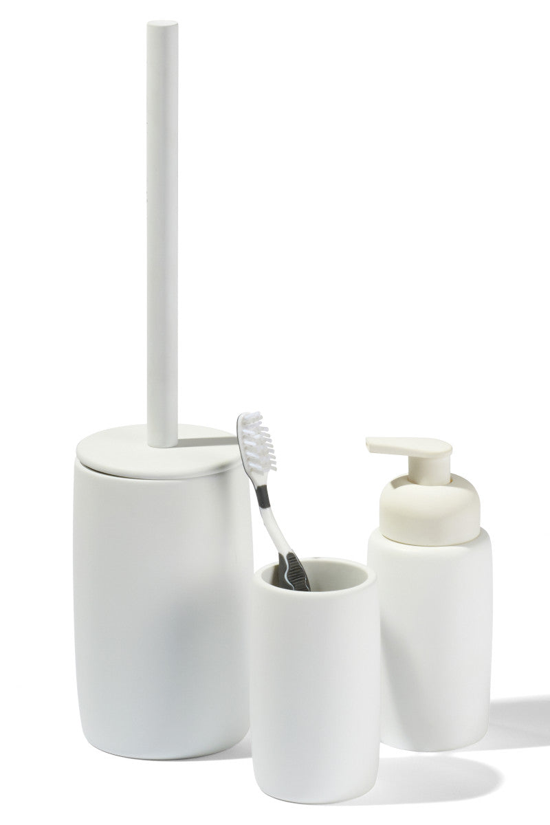 Södahls matte badeserie har en blød gummibelægning overalt, inklusiv på sæbedispenserens tud og toiletbørstens skaft. Kruset er udstyret med en attraktiv kontrastfarvet, blank glasur på indersiden.